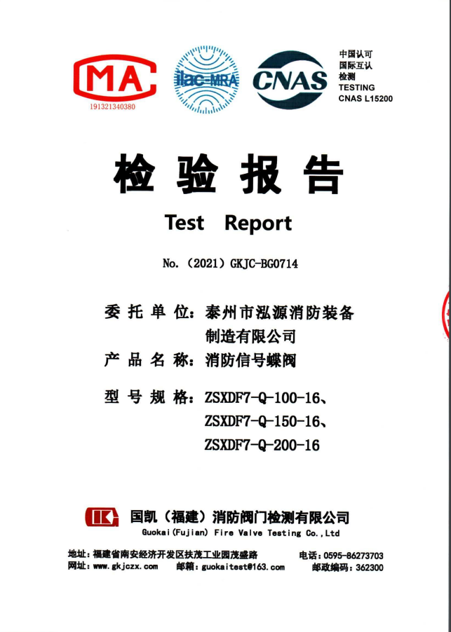 啟真(zhēn)對夾消防信號蝶閥ZSXDF7-Q檢驗報告